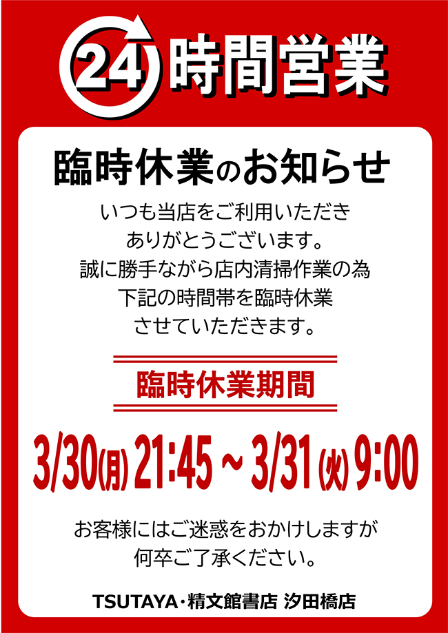 汐田橋店 3月30日㈪21時45分~3月31日㈫9時
