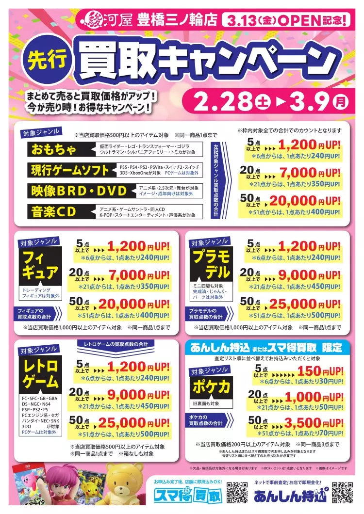 3/13(金)のグランドオープンに先駆け、 駿河屋豊橋三ノ輪店では 2/28(土)から3/9(月)までの10日間限定で 先行買取キャンペーンを実施中! 買取価格がアップする大チャンスです♪ 詳しくは公式サイト、Xをご確認ください。 皆さまのご来店を心よりお待ちしております✨ ・豊橋三ノ輪店公式サイト:駿河屋リアルストア | 駿河屋 豊橋三ノ輪店 | 中古・新品通販の駿河屋 ・豊橋三ノ輪店公式X:駿河屋豊橋三ノ輪店(@surugaya_minowa) / X