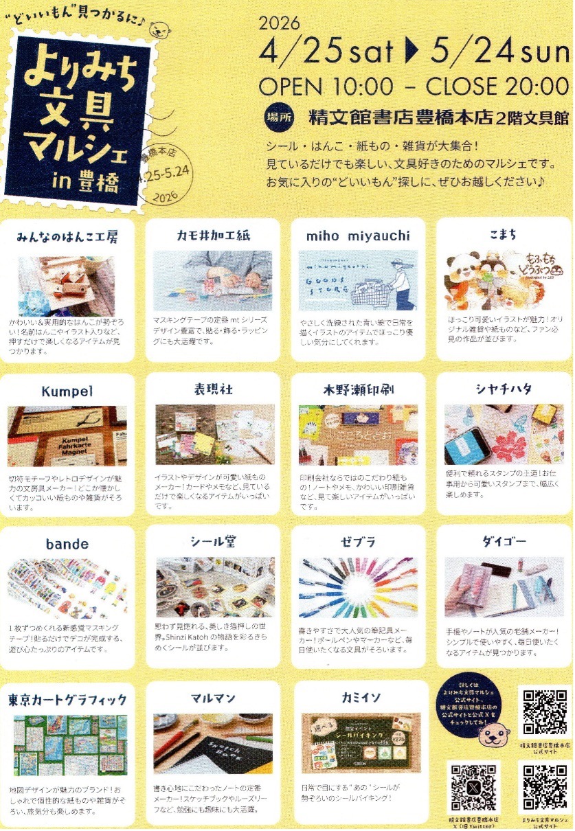 シール、はんこ、紙ものと雑貨を集めた文具好きのためのマルシェが東三河に登場!! ゴールデンウィークの予定に、ぜひ「文具館へのよりみち」を加えてくださいね️✨ “どいいもん”見つかるに♪ ↓よりみち文具マルシェin豊橋のサイトはこちら https://nagoya-ecole.jp/Yorimichi_StationeryMarche/ ■開催場所 精文館書店豊橋本店2階文具館 ■開催日程 期間:4/25(土)~5/24(日)
